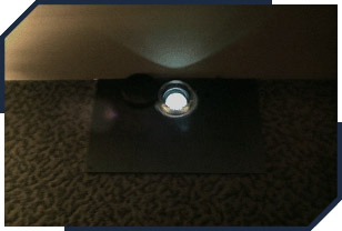 Below is a photo showing the lens on the rear wall of the theater. This cuts down on the noise, heat from projector, and cooling required given that it is mounted external to the theater. The other popular method of noise and heat reduction is to use a hush box which does just that - hush the projector by putting it in a box. Adequate cooling and ducting must be built into the box in order for the projector to keep the temperature down, however, the added work really pays off with nearly silent projector operation.